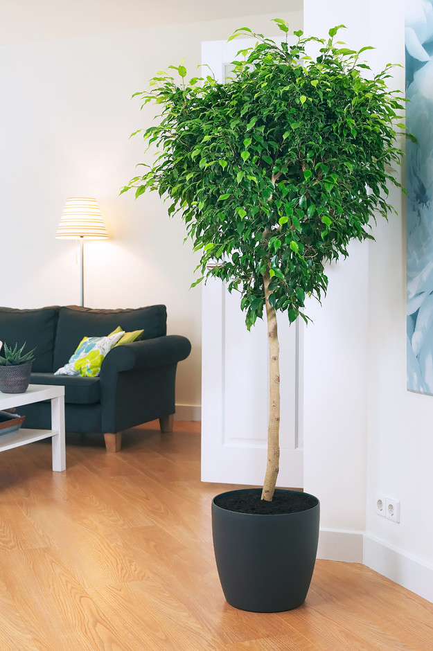 - Фикус Бенджамина. Изящные, слегка выгнутые ветви Фикуса Бенджамина сделали это великолепное растение очень популярным. Оно обладает ярко-зелёными листьями каплевидной формы и гладкой древесной корой, предпочитает яркий, непрямой свет и едва влажную почву. Не забудьте держать его вдали от холодных сквозняков и горячего сухого воздуха. У растения могут опадать листья осенью из-за снижения уровня освещённости.