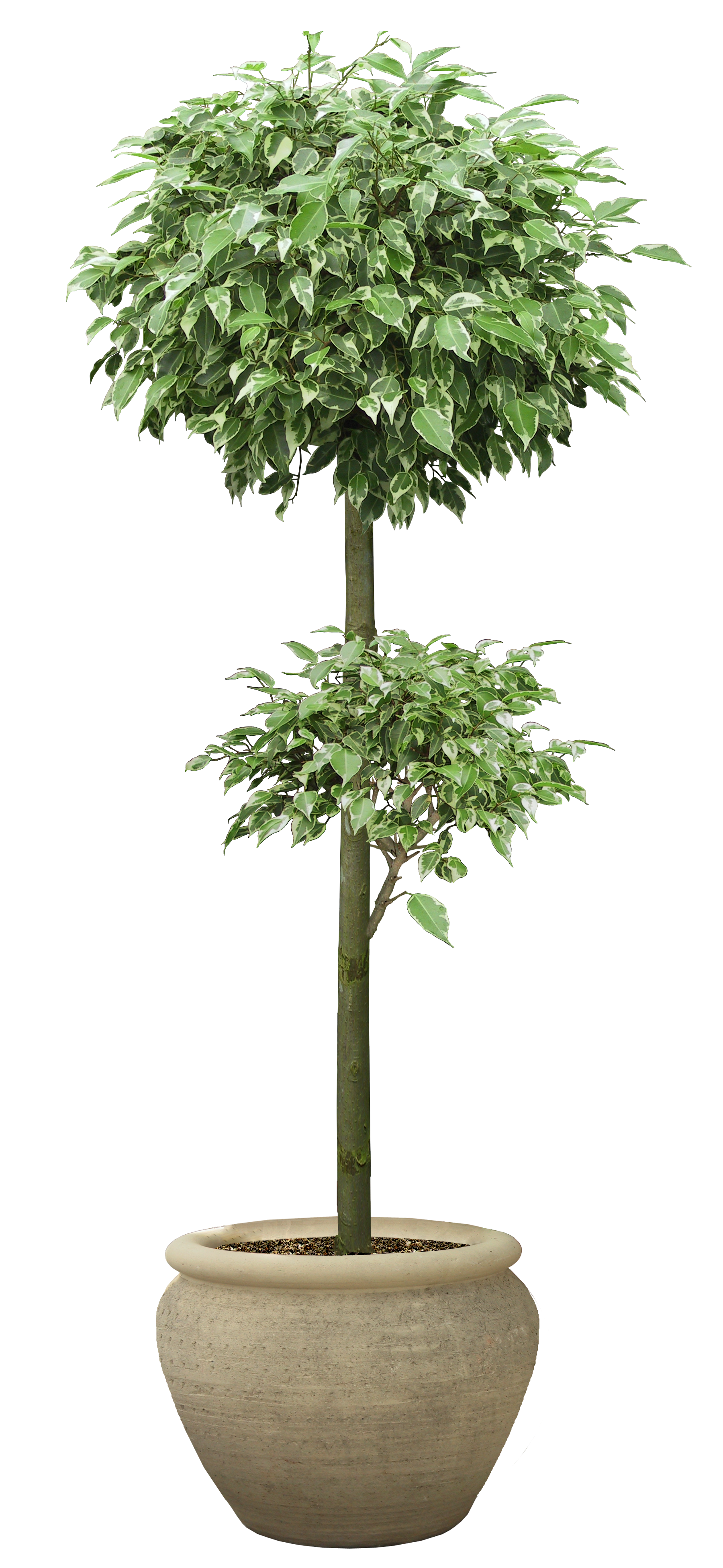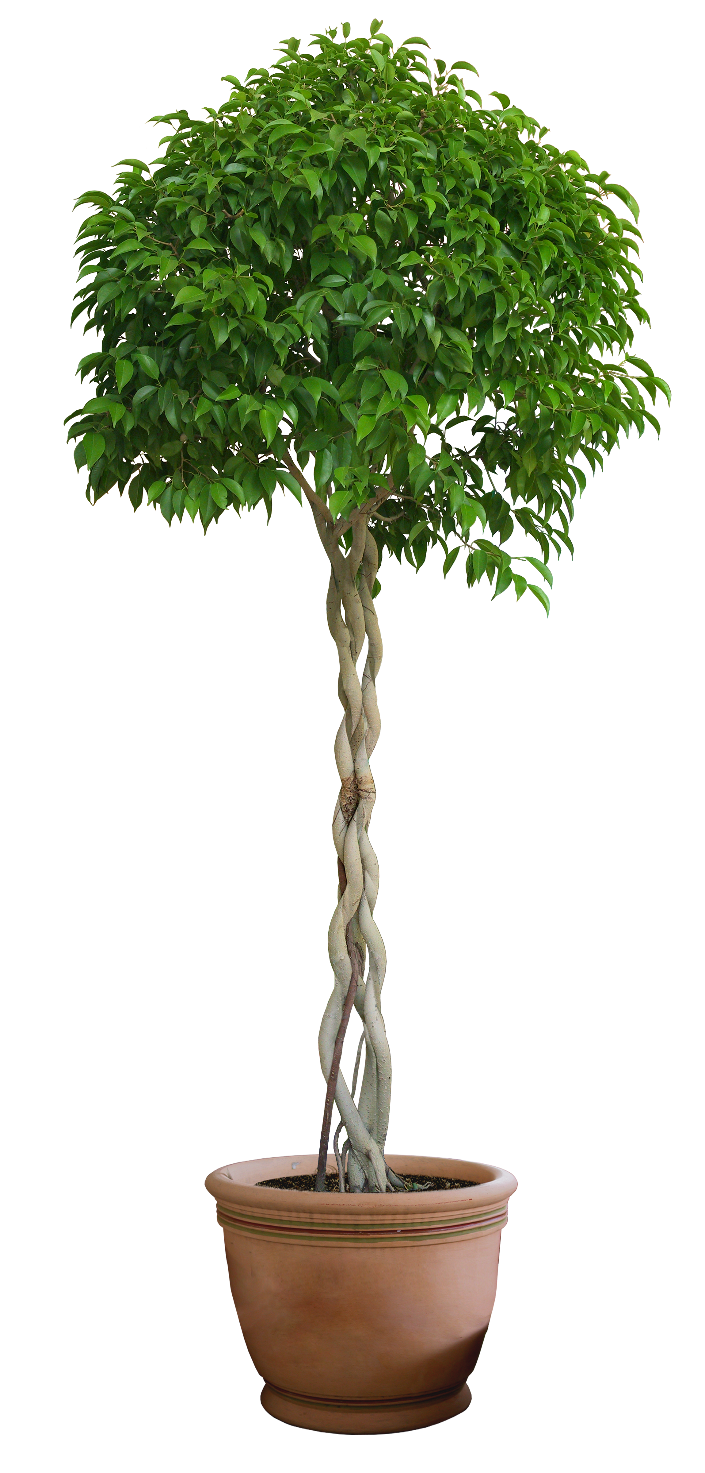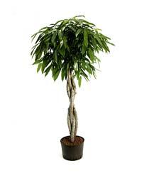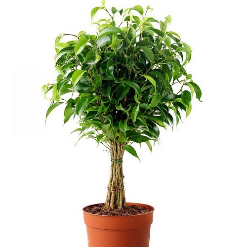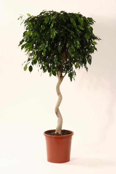 - Фикус Али благодаря своим длинным, стройным зелёным листьям, которые изящно свисают с ветвей, является одним из наиболее популярных комнатных деревьев. Этот фикус переносит разнообразные световые условия. Он отлично вписывается в интерьер гостиной, спальни или офиса. В помещении это почти безупречное растение может вырасти на высоту более 2 метров. Так как это уроженец тропиков его лучше поливать тёплой водой.