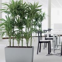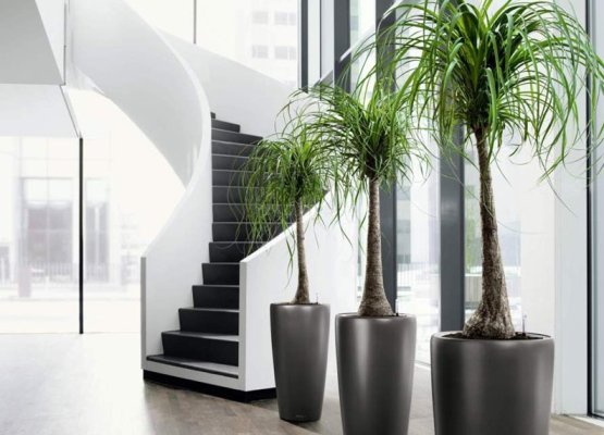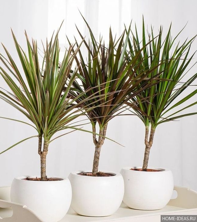 Это растение, не заставит вас чувствовать себя виноватым, когда вы отправитесь в отпуск. Оно хранит влагу в своей луковичной основе и может долгое время обходиться без воды. Этот вид также ценится за его каскадные, листья, которые никогда не увядают даже в жёстких условиях. Бокарнея относится к медленнорастущим растениям, поэтому, если вам нужно размерное дерево, купите самое большое растение, которое вы можете найти. В помещении они вырастают до почти до 2 метров. Лучшим местом для него является окно, обращённое к востоку или западу. - Мадагаскарское дерево драконов. Это комнатное растение соответствует любому декору. Оно имеет травянистые зелёные листья с красными или розовыми краями. Кустик Мадагаскара лучше всего себя чувствует в ярком свете, но может выжить и в тёмных углах – просто потеряет часть своей красной окраски. Это растение относительно нетребовательно и может вырасти до 2 метров в высоту.
