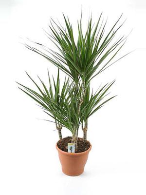 - Цветок драцена окаймлённая. Наиболее популярная среди прочих видов. На родине это растение может достигать 6 метров. Ввиду декоративности тонкого длинного листа эту разновидность нередко называют драконьим деревом. У цветоводов этот вид растения чаще встречается под названием Маргината. В условиях помещения этот вид драцен выращивают в контейнере, где по мере роста постоянно удлиняется и оголяется ствол и нарастает крона с декоративно окрашенной листвой. На острове Мадагаскаре эти растения в течение нескольких лет растут, цветут и даже плодоносят. В комнатных условиях можно увидеть кистевидное соцветие очень редко. Распространёнными сортами драцены окаймлённой являются: Colorama, Bicolor, Tricolor, Sandera.