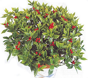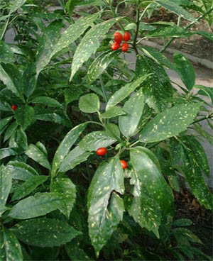 Маленький вечнозеленый кустарник имеет кожистые и большие листья овальной формы. Цветочки у него мелкие, но они содержат плоды разного цвета: