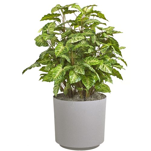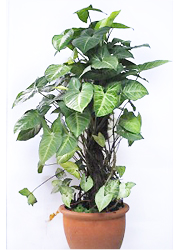 Яркий представитель семейства ароидных, коренной житель Южной и Центральной Америки, сингониум — экзотическая быстрорастущая лиана с яркими стреловидными листьями, воздушные корни которой цепко обвивают стволы крепких тропических деревьев в естественной среде, пробиваясь поближе к солнечному свету. По мере роста растению необходима направляющая опора, покрытая сфагнумом, который должен быть всегда влажным. Этот вариант наиболее подходит для вертикального озеленения. Необычайно эффектно сингониум смотрится и в ампельном исполнении: свисающая листва образует пышное ковровое покрытие, радующее глаз яркими зелёными красками.