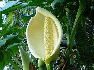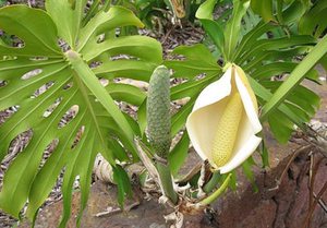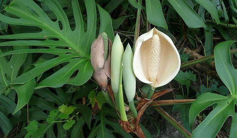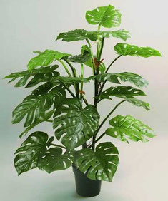 Растение монстера имеет форму кустарника с толстыми лазающими стеблями и свисающими воздушными корнями. Листья у растения крупные, плотные и кожистые, на длинном черешке. Цветёт монстера оригинально, ее цветок имеет вид длинного толстого цилиндрического початка на ножке-цветоносе.