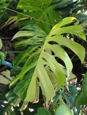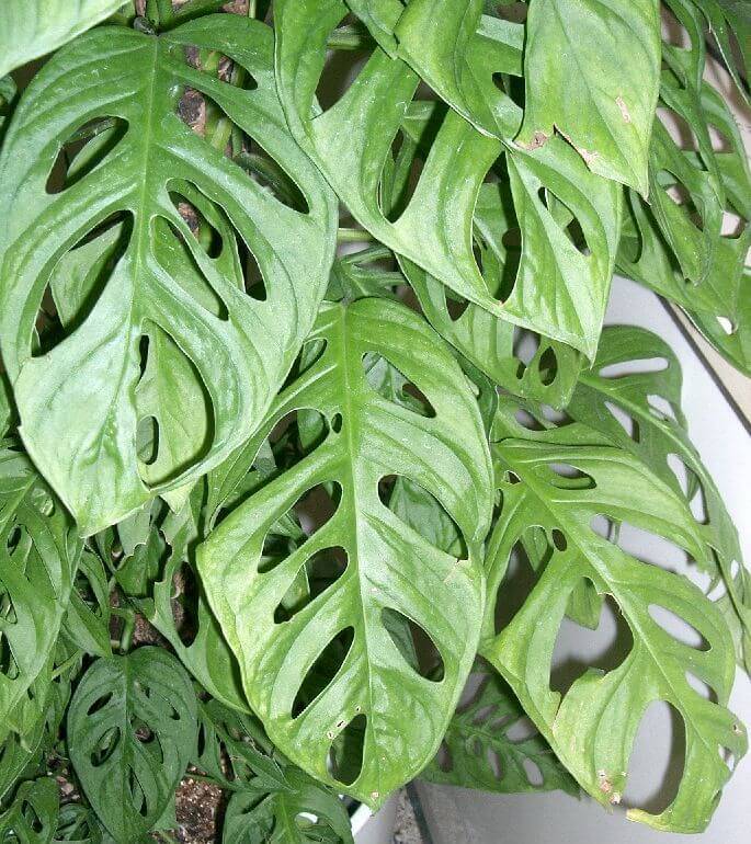 - Mонстера косая (Monstera obliqua) или серповидная. Родиной этого растения с воздушными корнями являются влажные бразильские леса и Гвиана. Эта лазящая лиана имеет цельные эллипсовидные листья длиной до 20 см и шириной до 6 см на коротком черешке. Цветок монстеры косой также небольшой и располагается на коротком цветоносе. Початок имеет умеренные размеры и малое количество цветков.