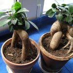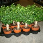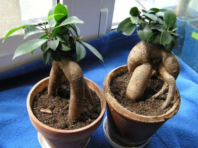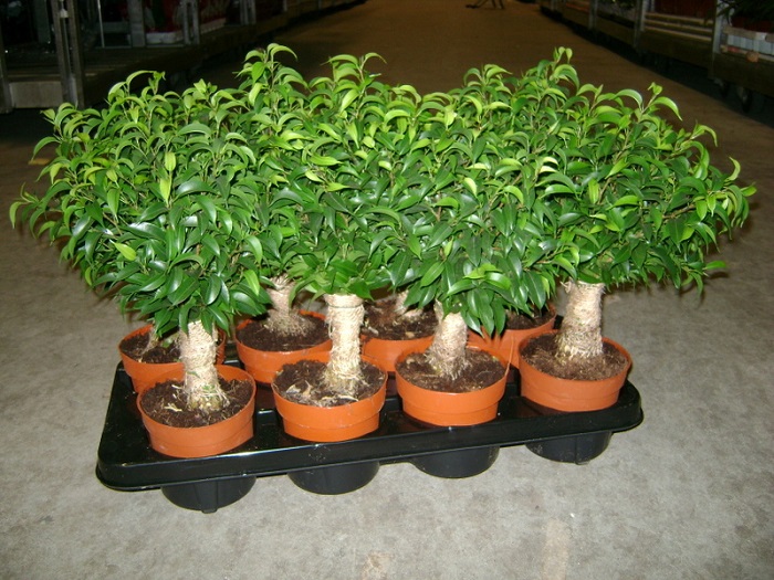 Бонсай. Представляет собой карликовый фикус или комнатное растение в миниатюре. Формирования такого вида начинается зимой, пока движение сока замедленное. Для этого молодые отростки крепко стягивают проволокой и фиксируют их относительно ствола, изгибая их в определенное положение. Через 7 месяцев проволока снимается, а отростки продолжают расти в нужную сторону.- Микрокарпа. Фикус имеет большое сходство с Бенжамином, имеет листья ярко-зеленого цвета.