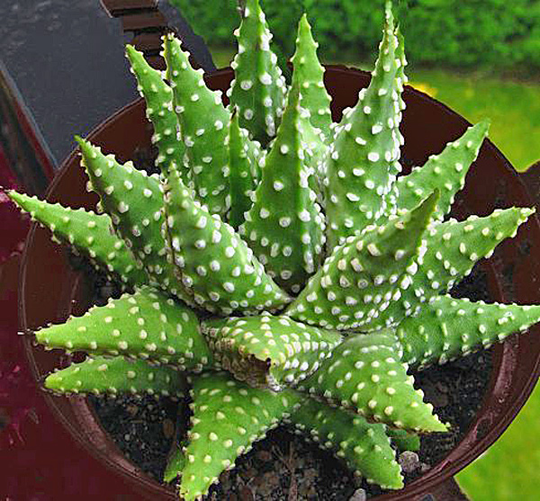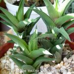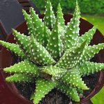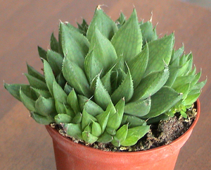 - Хавортия жемчужная отличается мясистыми овальными листьями, достигающими в длину 8 сантиметров. У растения отсутствует стебель. Листья раздуты в нижней части и сильно заужены и заострены вверху. По бокам листиков находятся колючие наросты перламутрового цвета. Цветки хавортии жемчужной имеют светло-зеленую окраску и собраны в кисти-метелки. После цветения растение погибает, но его замещает дочернее.