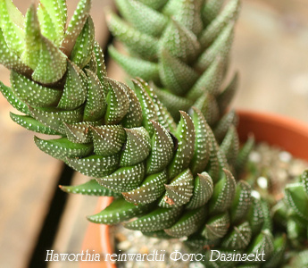 - Хавортия Рейнвардта достигает в высоту 15-20 сантиметров. У нее отсутствует прикорневая розетка. Треугольные листья заострены на концах и загнуты внутрь, сверху имеют гладкую поверхность, с внутренней стороны покрыты белыми наростами. Кактус цветет ярко-желтыми цветками, которые собраны на длинный цветонос.