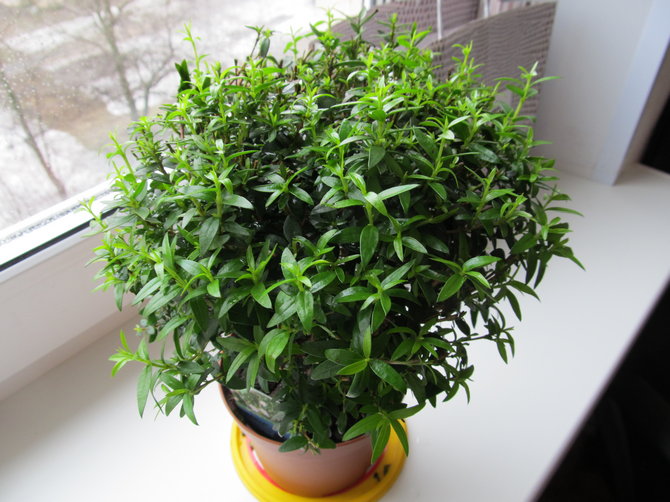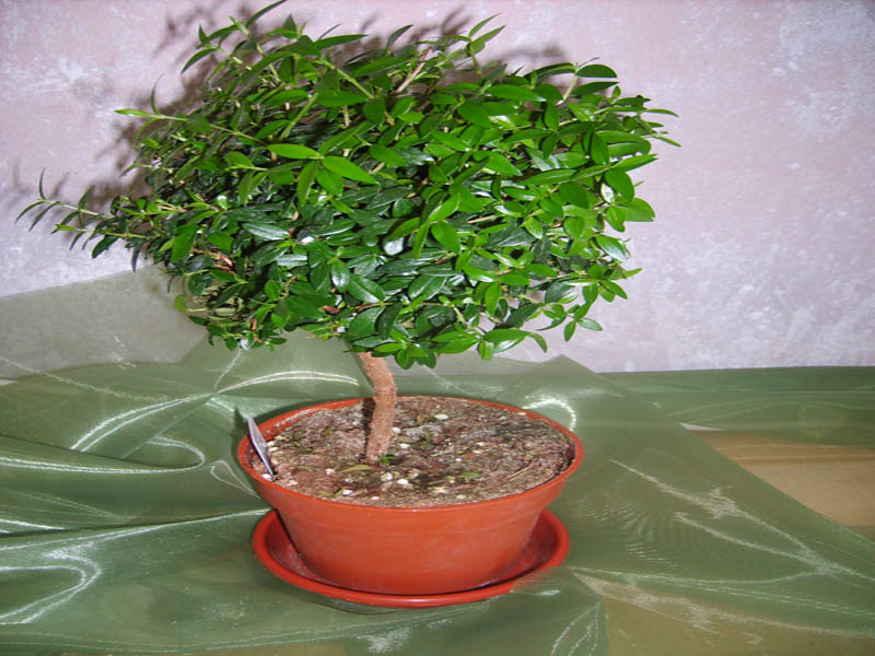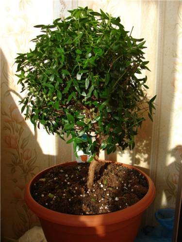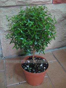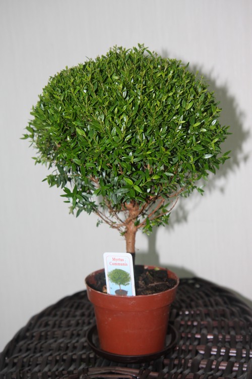 Посадки закрываются плёнкой и выращиваются при свете, а комнатная температура должна составлять не менее 22 градусов. Из почвы мирт появится через две недели. После достижения растением высоты от семи сантиметров побег можно пересаживать. Важно то, что необходимо придавать форму будущему дереву, отслеживая и ощипывая ненужные побеги.
