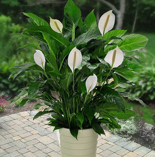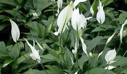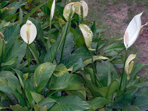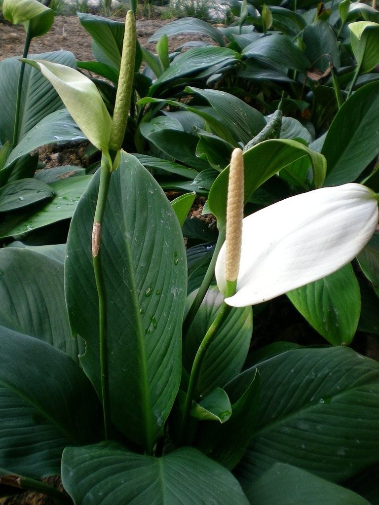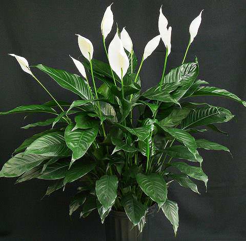 - Спатифиллум обильно цветущий. Родина Колумбия. Растет до 1,5 м, листья растут густо, по форме овально-ланцетные, достигают длины в 25 см, ширины — 10 см. Верхняя часть листа бархатистая темного цвета, нижняя часть — намного светлее. Цветет очень обильно и продолжительно початком с белым покрывалом.