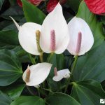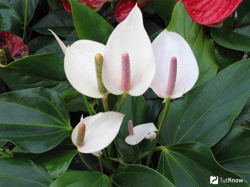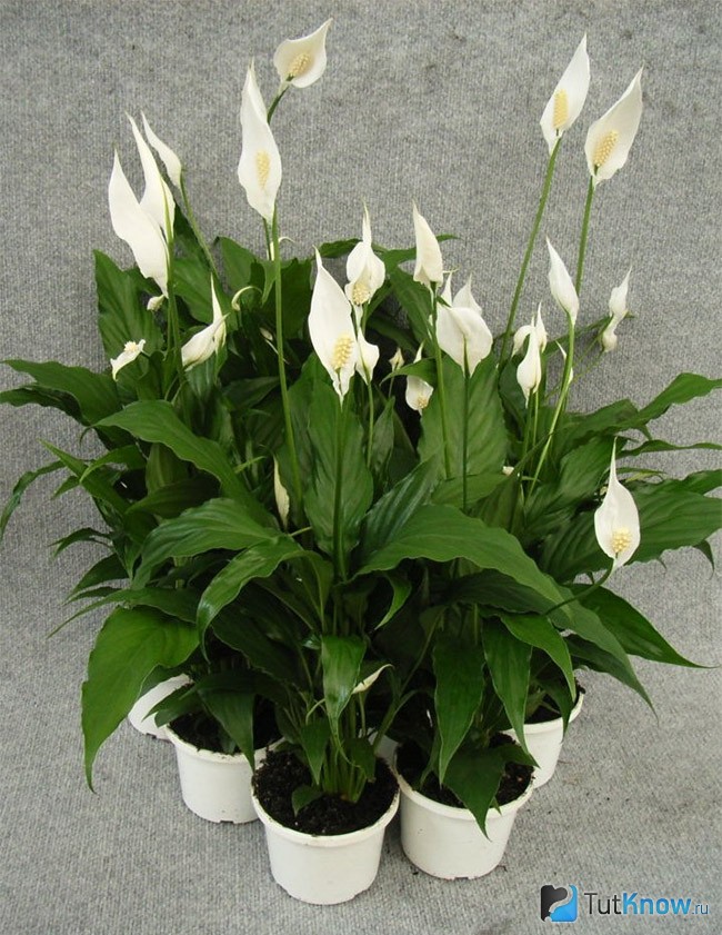 Спатифиллум Уоллиса. Куст компактных размеров вышел из влажных колумбийских лесов. Имеет изящные продолговато-ланцетные листья. Початок, как и покрывало, белого цвета, последний превосходит початок по длине втрое. Цветение обильное и продолжительное.- Спатифиллум Домино. Очень популярный сорт, выведен на основе Уоллиса. Отличается от него пестрыми бело-зелеными листьями.