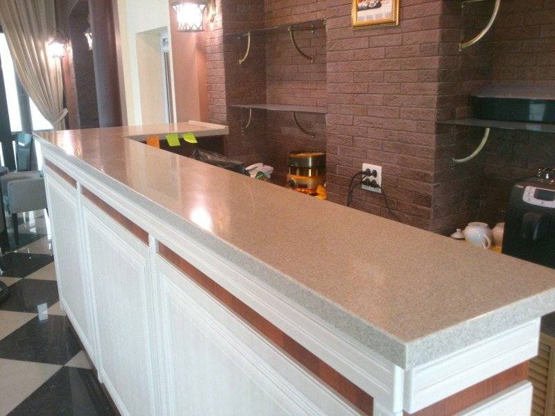 Практичность искусственного камня доказана долгими годами использования. Его уникальные свойства позволяют создавать изделия любых размеров. Благодаря бесшовной технологии соединения отдельных частей, они кажутся монолитными и могут принимать различные формы. Таким образом, изделия из искусственного камня идеально вписываются в помещения самого различного типа и стиля. Помимо этого, бесшовные соединения позволяют легко и без лишних усилий заменить части стойки или реставрировать их в случае повреждений. Соответственно, Вам не нужно будет тратиться на новую столешницу, что значительно сэкономит время и деньги.