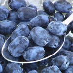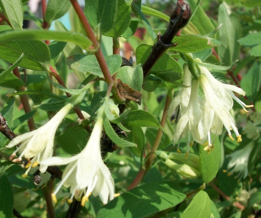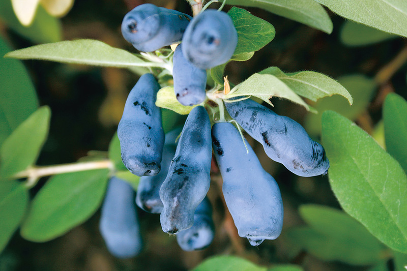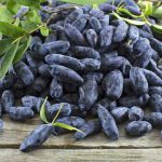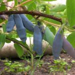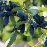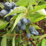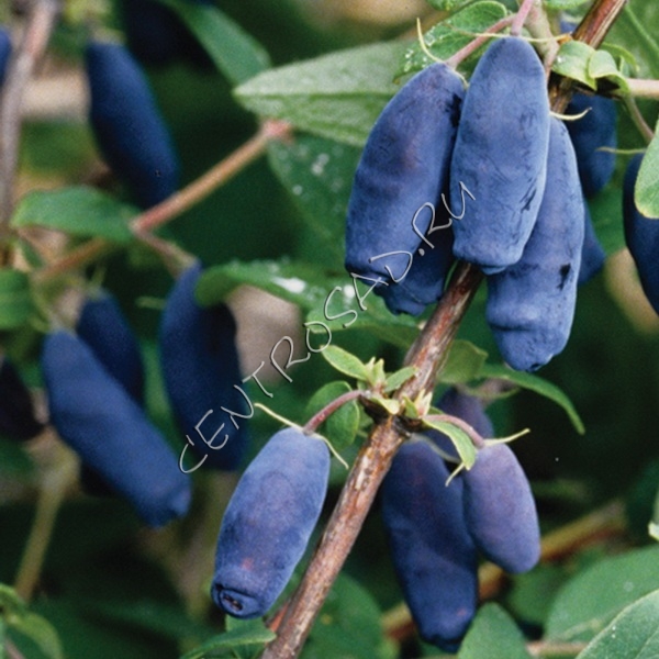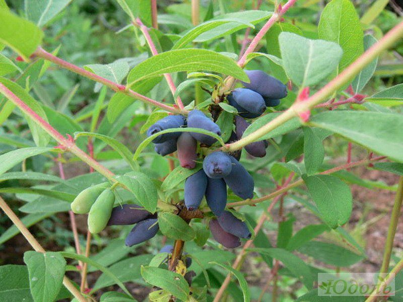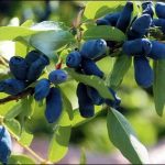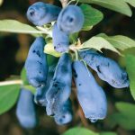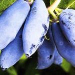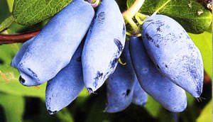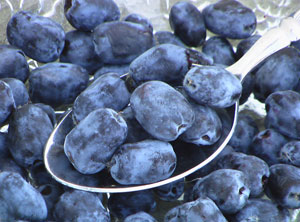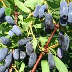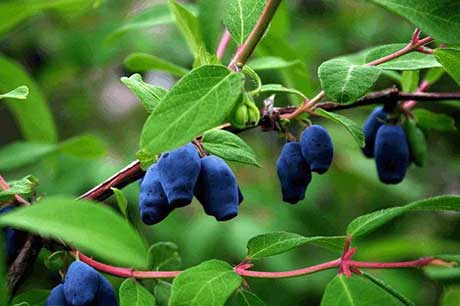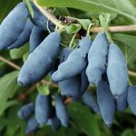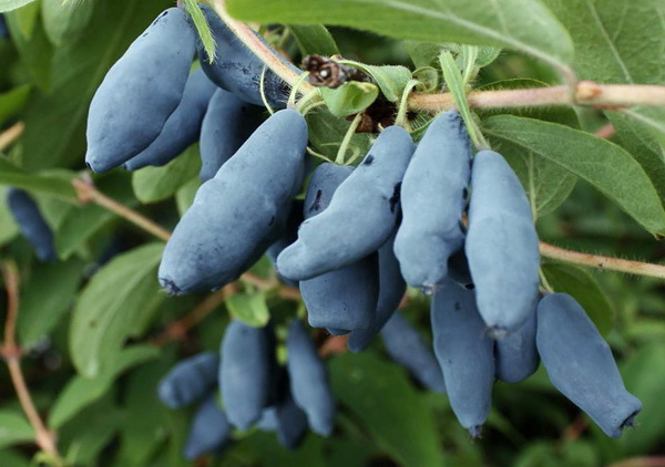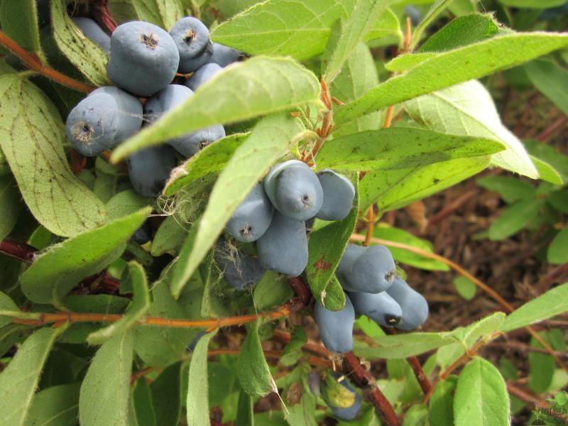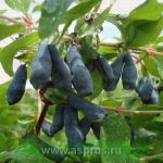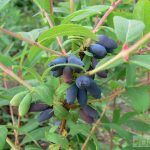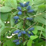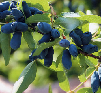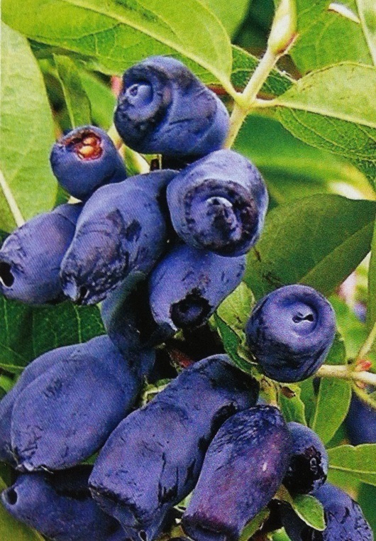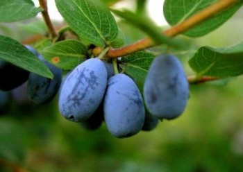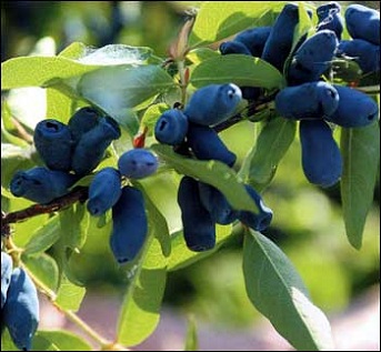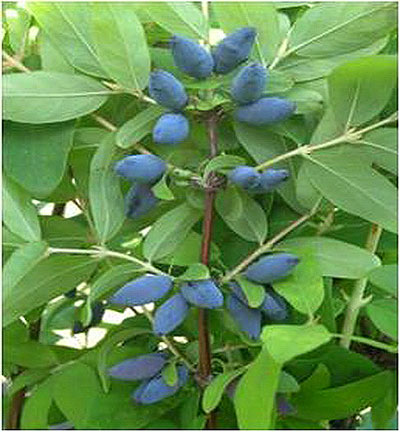 - Жимолость голубая значительно выше жимолости съедобной. Его высота может достигать 2,5 метра. Крона у этого кустарника небольшая. Побеги прямые с бурой корой, которая легко отделяется от ствола. Листья имеют эллиптическую форму. Их длина не превышает 6 см, а ширина 3-х см. Цветы имеют колокольчатую форму и располагаются соцветиями в пазухах нижних листьев. Ягоды у этого вида имеют темно-голубой или синий цвет и эллиптическую форму и по вкусу напоминают чернику.