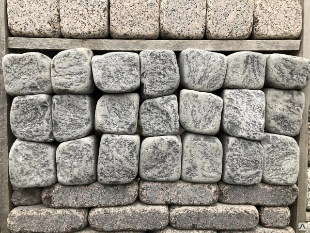 Это объёмный элемент мощения, вырезанный из массива натурального гранита. Форма обычно приближена к прямоугольному параллелепипеду, а размеры варьируются от 5×10 см до 20×20 см (и более), в зависимости от назначения. Брусчатка может иметь колотую, пиленую или термообработанную поверхность, что влияет как на внешний вид, так и на эксплуатационные свойства.