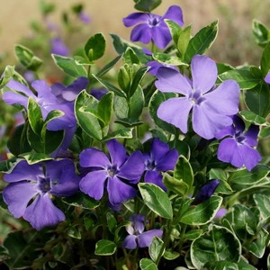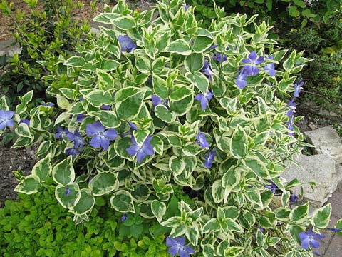 - Барвинок пестролистный зачастую используют в декоре каменистых садов и горок. Этот многолетник может хорошо расти практически на любой почве. Если говорить о его внешнем виде, то он имеет яркие серо-голубые цветочки.