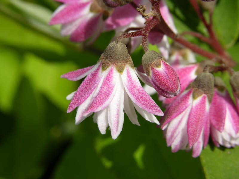 . Невысокий кустарник, достигающий 1,2 м в высоту, обычно шаровидной формы. Цветки махровые, белые с одной розовой стороной, а листья острые и покрытые волосками. В отличие от шершавой, дейция махровая начинает цвести раньше, а заканчивает – позже. Особенно ценится именно за длительность цветения. - Никко или дейция изящная. Куст дейции Никко едва достигает 80 см. Начинает цвести дейция изящная уже в конце мая, а в сентябре листья окрашиваются в пурпурно-багровый цвет.