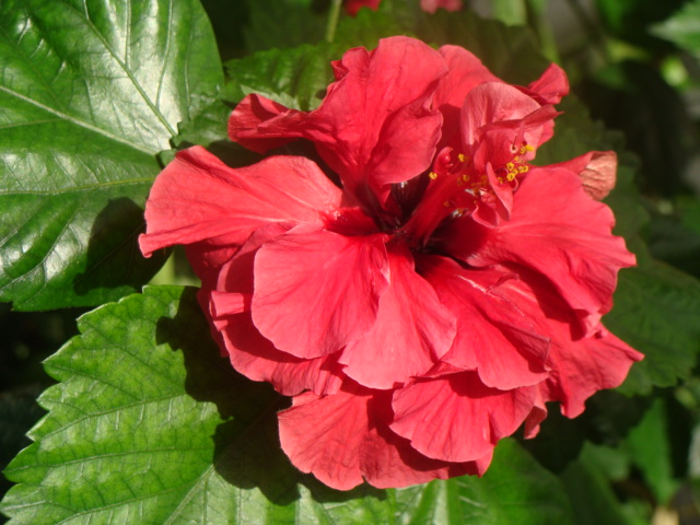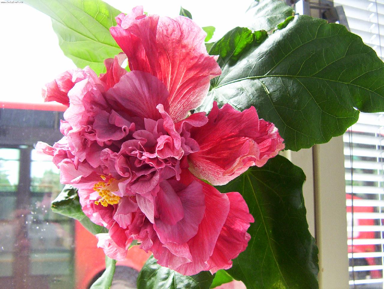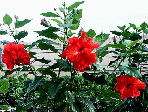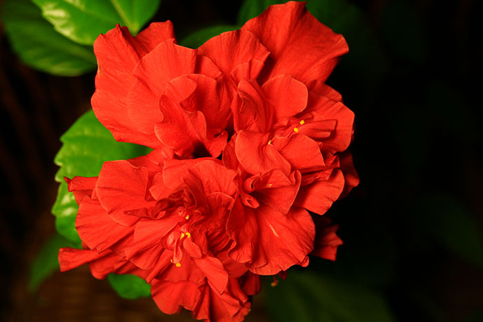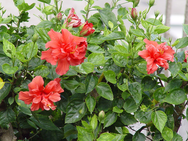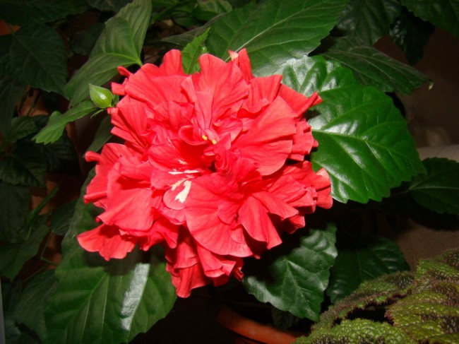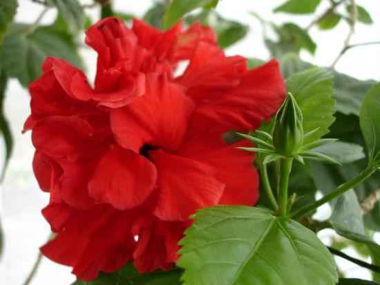 Листья у китайской розы комнатной большие, темно-зеленые, но есть и пестрые разновидности. Цветы махровые, довольно крупные, белого, кремового цвета и красных оттенков от яркого алого до бордового, почти черного. При правильном уходе роза радует цветами все лето.