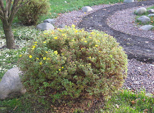 После отцветания, созревают семенные плоды. Они напоминают маленькие лепёшки чёрного цвета. Это придаёт особую декоративность кустарнику. Лапчатка быстро разрастается и создаёт эффектную пушистую крону округлой формы.