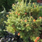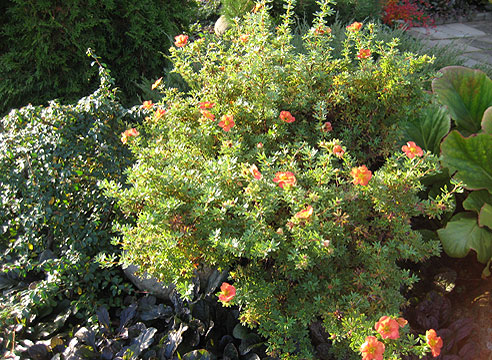 - Лапчатка Фламбе. Активно ветвящийся кустарник с густой шаровидной кроной из листьев. Листва рассечена на более мелкие подлистники. Из-за пушка на поверхности, приобретают стальной оттенок. Цветки полумахрового типа, красно-вишнёвого колера. Растение устойчиво к морозу и засухе, но не терпит сухой воздух.