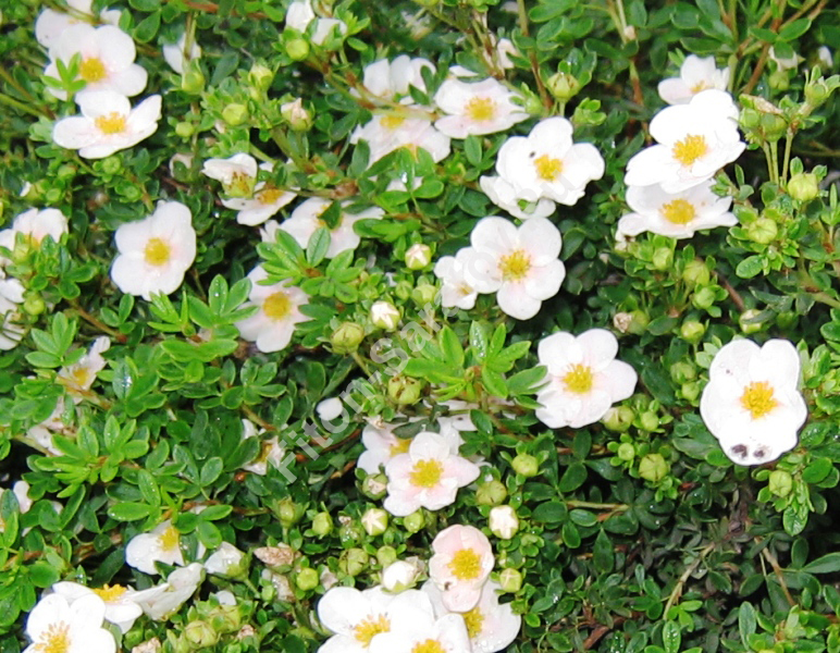 Кустарники вырастают в высоту до 1,5 метра, а в ширину — 1 метр. Стебли в большинстве случаев прямостоячие, сильно разветвлённые. Бывают ползучего типа. Листья пятидолевые, имеют лёгкое опушение. Структура цветка пятилепестковая, округлая, с тычинками в центре. Период цветения выпадает на июнь и длится до самой осени.