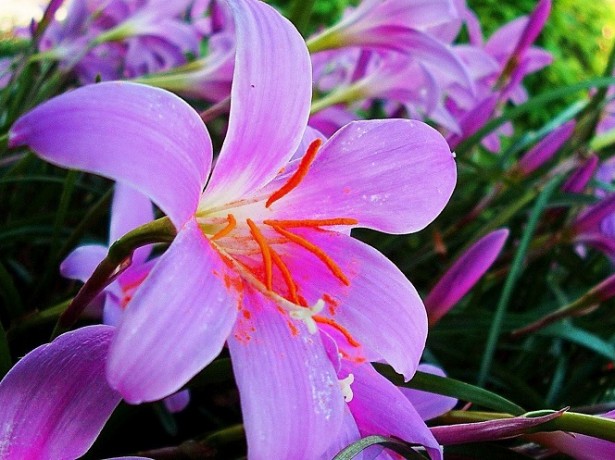 Вокруг пестика располагается 6 тычинок, имеющих крупные мохнатые пыльники. Простые виды имеют 6 лепестков, махровые экземпляры могут обладать большим количеством. Цветы бывают звездчатой, колокольчатой, воронковидной, трубчатой, чалмовидной, чашевидной и плоской формы. Лепестки отличаются многообразием в оттенках, причем они могут сочетать несколько тонов, иметь каемку или вкрапления в виде мазков или точек. Созревание плодов происходит в октябре — ноябре.