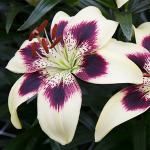 - Строберри Энд Крим – крупные лилии с основным светло-розовым оттенком и темно-пурпурным налетом от зева до середины лепестков.