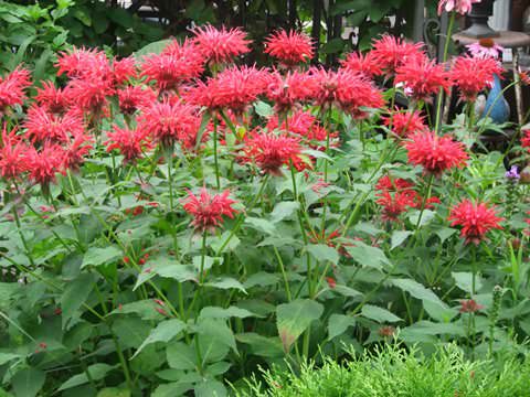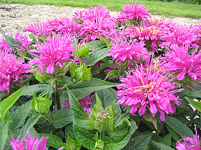 Монарда гибридная бергамот. Соцветия розово-пурпурной окраски имеют многоярусную структуру. Цветут с июля до наступления заморозков. Высота куста 55 см. Душистый аромат кружит голову и привлекает пчел. Отличными спутниками этого гибрида станут стелющиеся можжевельники или иные хвойники, низкорослая японская айва, различные очитки, тимьяны, карликовый золотарник. Сорт является победителем многих селекционных конкурсов.- Монарда Пинк Лейс. Это компактный низкорослый куст, не превышающий 50 см в высоту. Удобен не только для клумб, но и для горшечного выращивания. Растение отличается своим очень стойким ароматом. Цветет практически все лето. Благодаря яркому цветению не терпит рядом с собой конкурентов. Поэтому лучше всего Пинк Лейс компоновать с зелеными кустиками кохий или нейтрально-белыми ромашками.