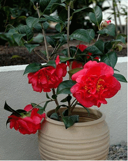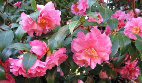 Цветки чаще всего скреплены по 2–3 бутона, размер не превышает 7 см в диаметре. А также зацветает в зимний период с ноября и заканчивает цветение ранней весной. Именно такая камелия чаще всего подвергается одомашниванию и посадке в саду.