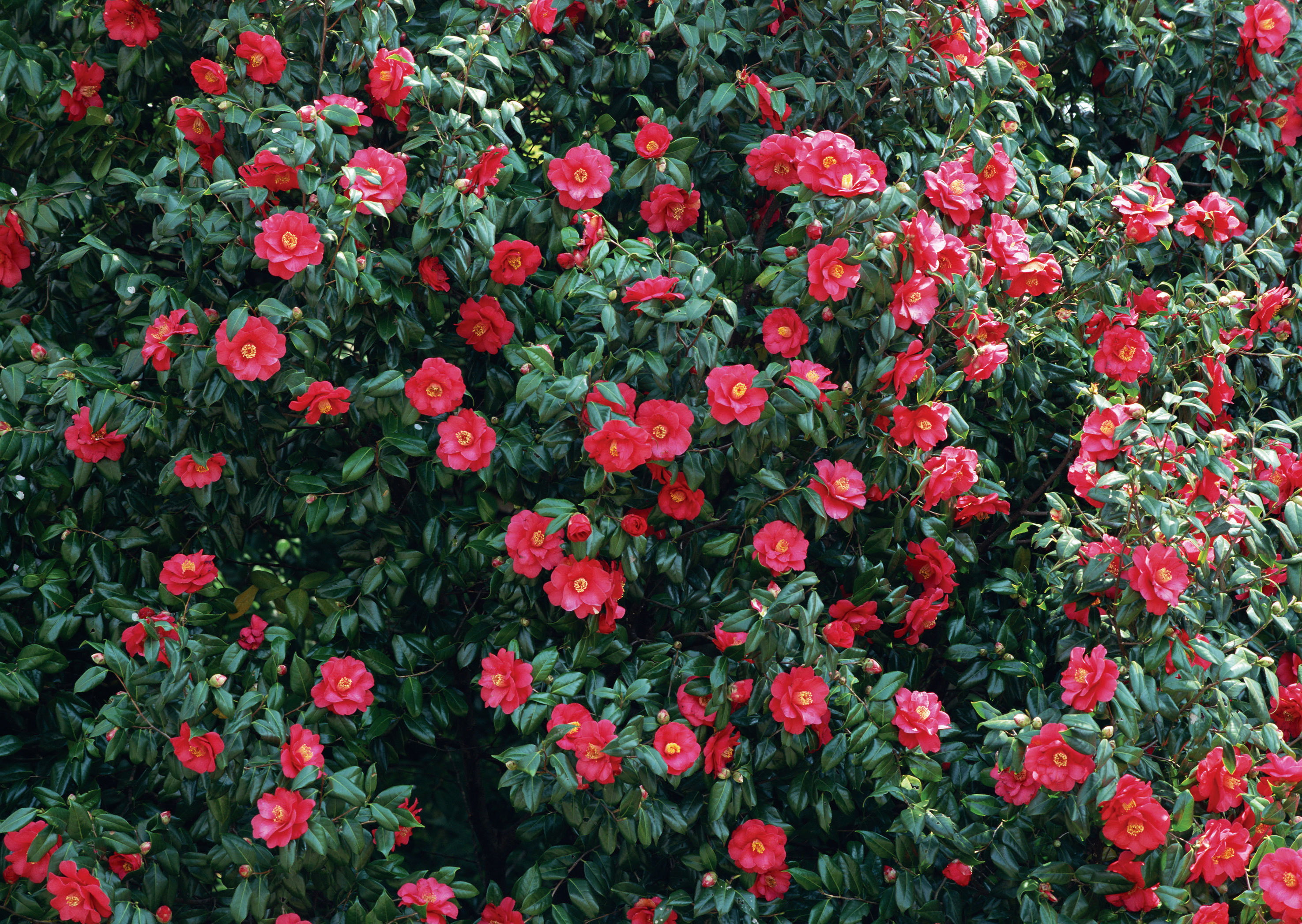 Одним из самых красиво цветущих домашних растений можно назвать камелию комнатную. Она растёт кустиками или маленькими деревцами. Имеет довольно крупные листья и невероятно красивые бутоны. На ощупь листья как будто покрыты слоем воска сверху. Бутоны яркие, шириной в пределах 15 см.