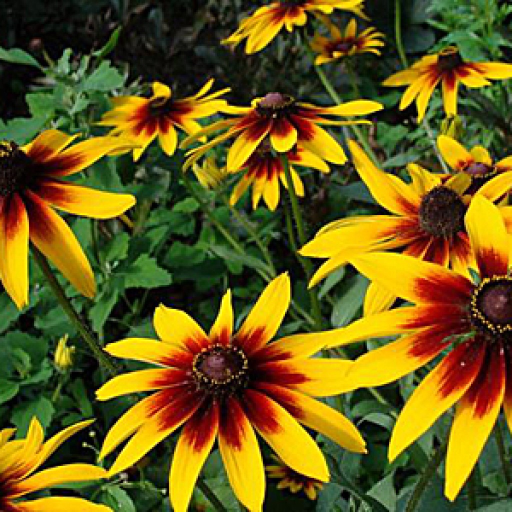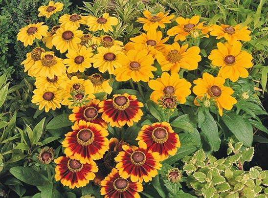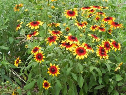 - Рудбекия двухцветная. Это прямостоячее растение, которое имеет невысокие кусты, высотою от тридцати до семидесяти сантиметров. Оно имеет яркие растения, как правило, многоцветные и оснащенные двумя рядами язычковых ярких цветков с темным основанием. Такие растения цветут обычно все теплое время года, начиная в начале июня и заканчивая с приходом заморозков. Самый известный сорт многолетних растений – это Гербсвальд, который отличается невысокими кустами и красно-коричневыми цветками, имеющими приятный запах.