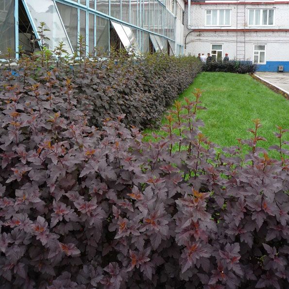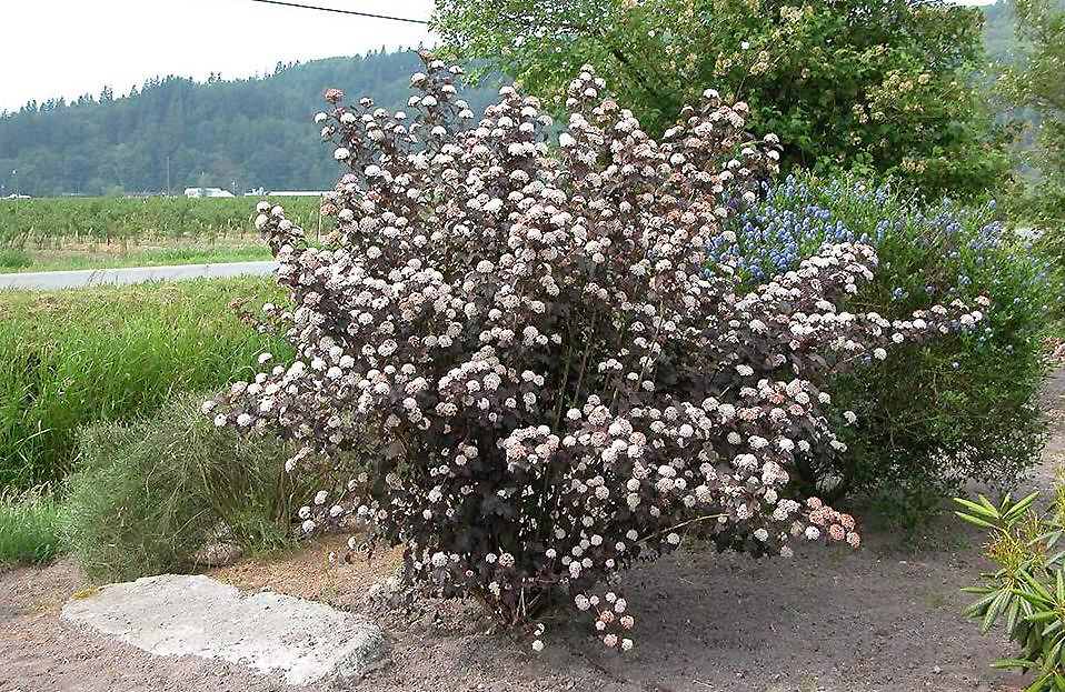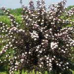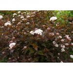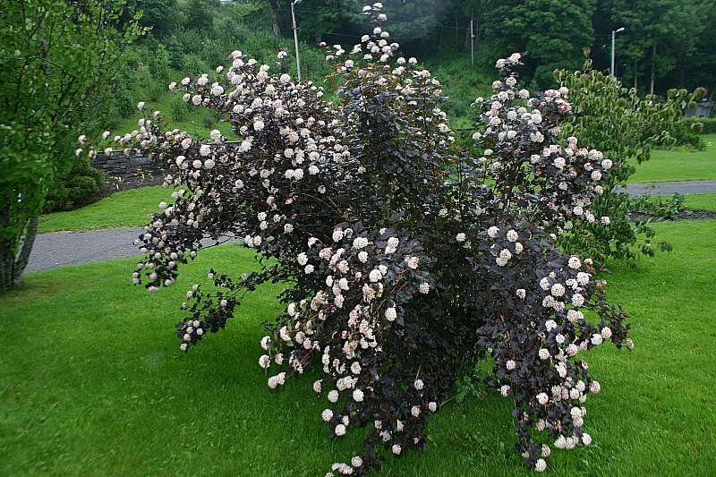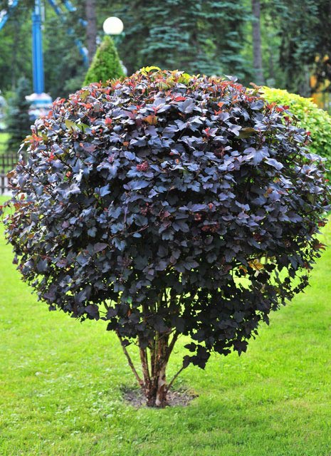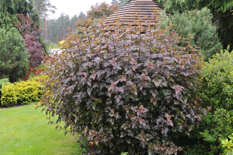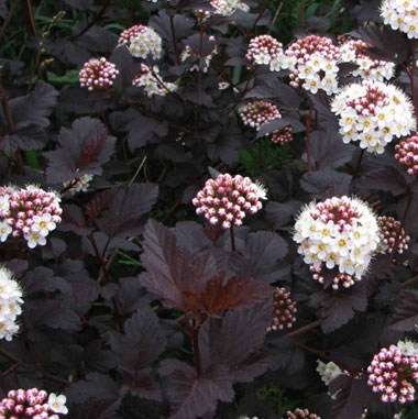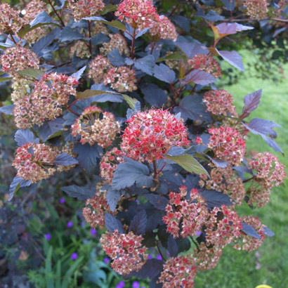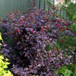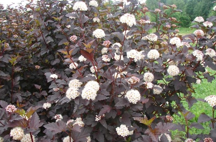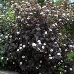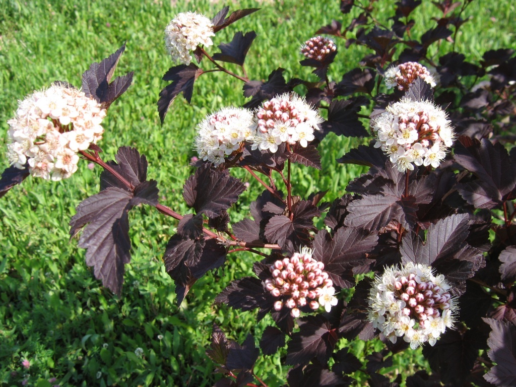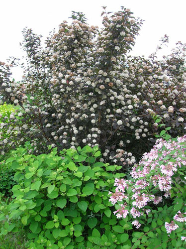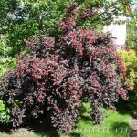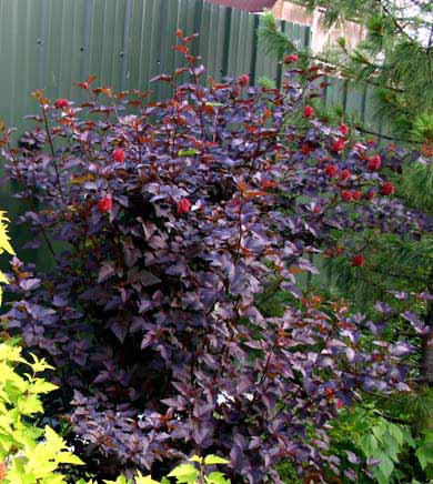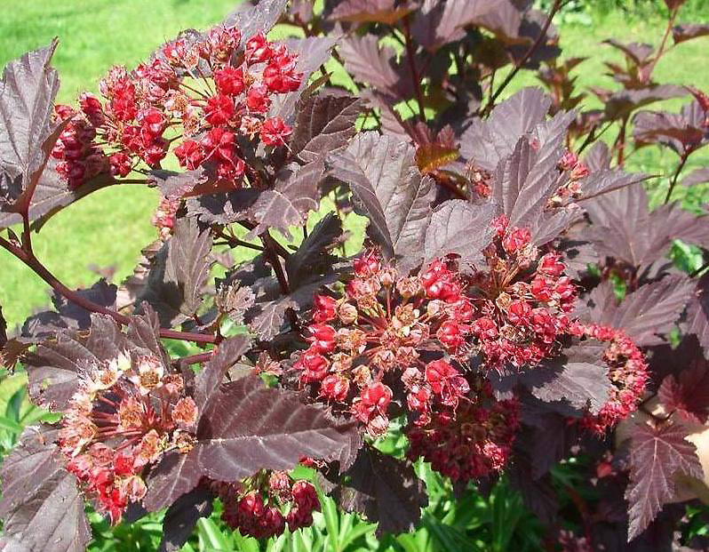 - Пузыреплодник калинолистный Диабло или краснолистный – растение с красивыми темно-бордовыми листьями очень любим садоводами. Однако такую окраску можно получить только на хорошо освещенных участках. В полутени и тени листовые пластины становятся буровато-зелеными. Кустарник вырастает до трех метров и с середины июня на нем распускаются розовые цветки. Пузыреплодник краснолистный можно использовать для создания живых изгородей, которые получаются плотными и яркими.