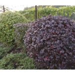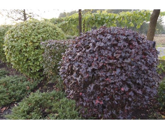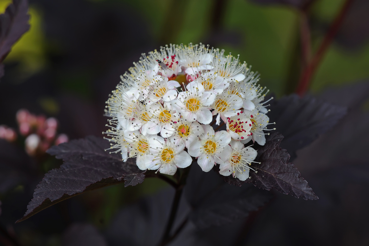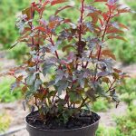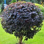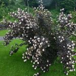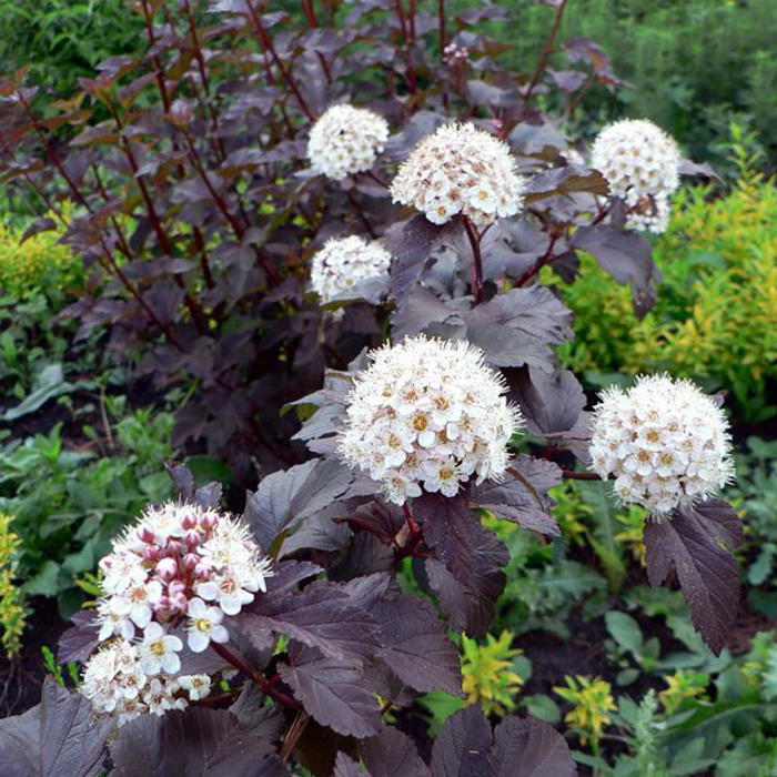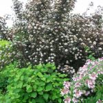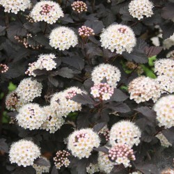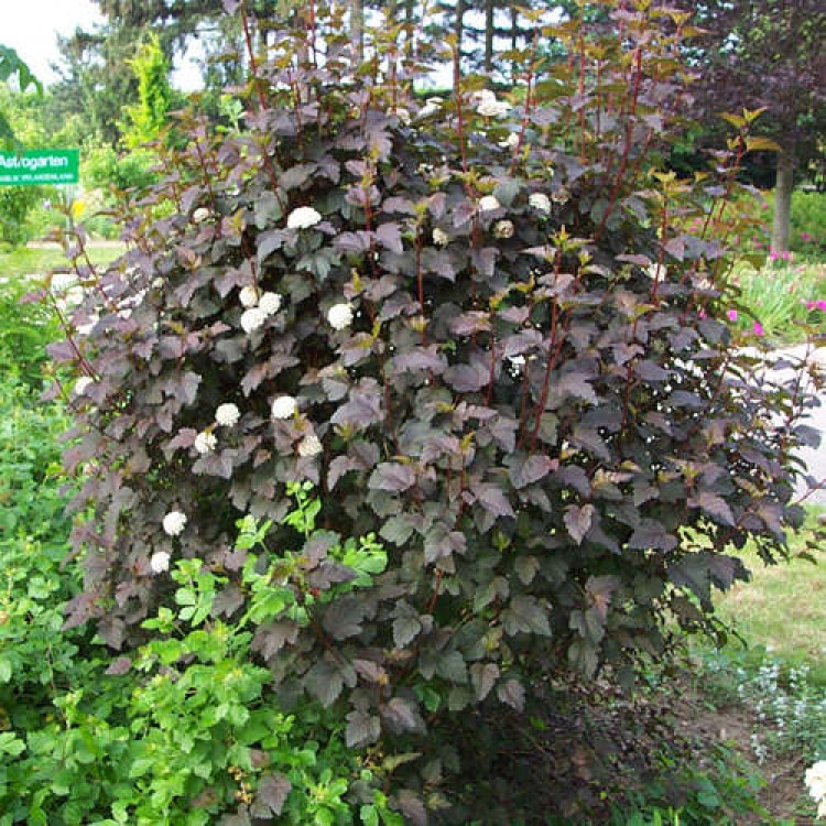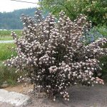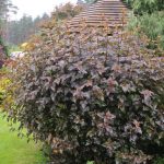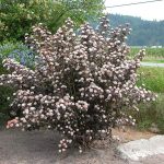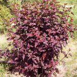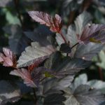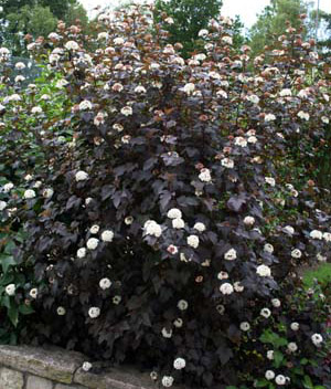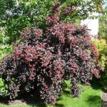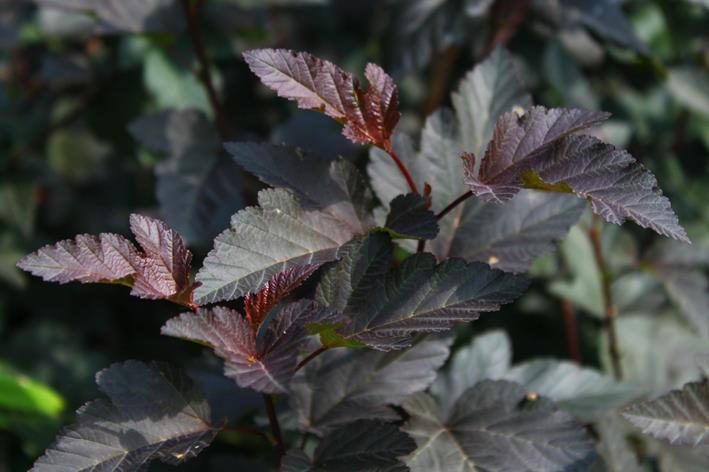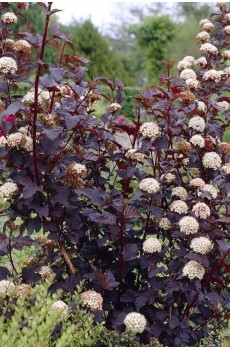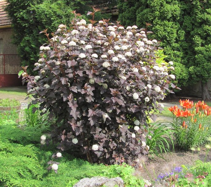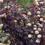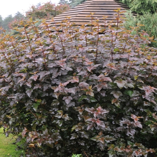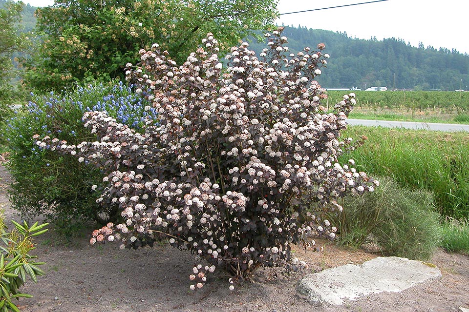 - Пузыреплодник калинолистный Диабло или краснолистный – растение с красивыми темно-бордовыми листьями очень любим садоводами. Однако такую окраску можно получить только на хорошо освещенных участках. В полутени и тени листовые пластины становятся буровато-зелеными. Кустарник вырастает до трех метров и с середины июня на нем распускаются розовые цветки. Пузыреплодник краснолистный можно использовать для создания живых изгородей, которые получаются плотными и яркими.