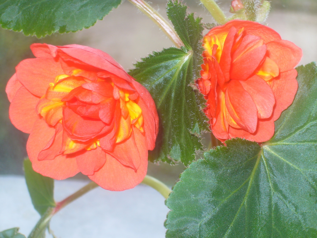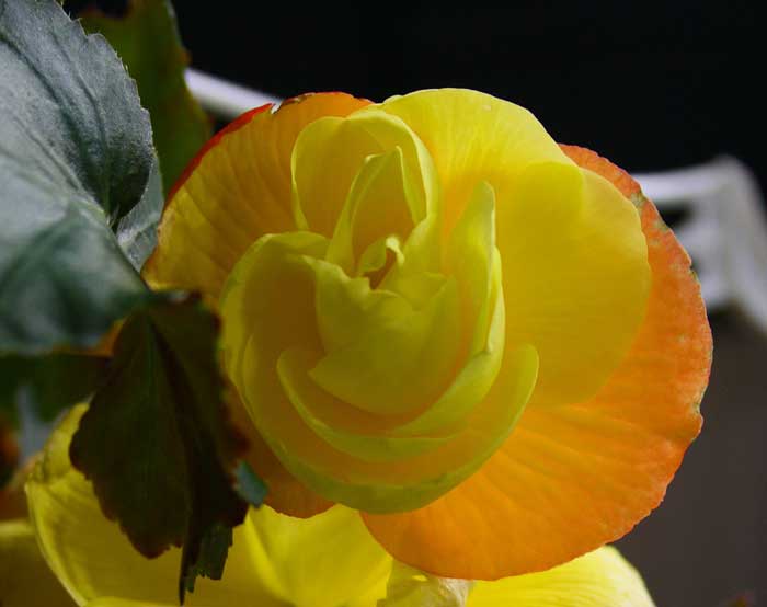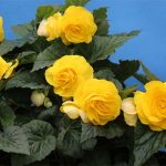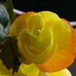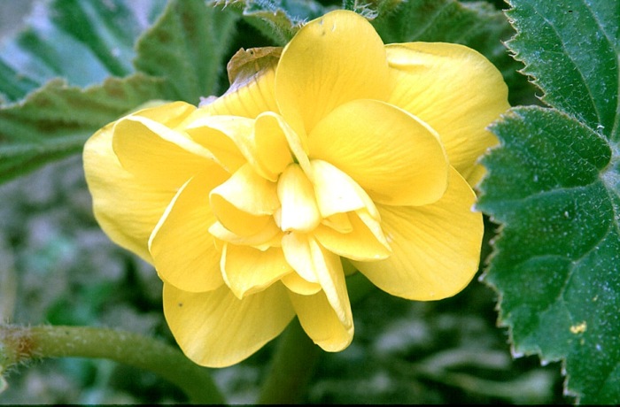 - Бегония жёлтая. Кустарник с ползучим стеблем и крупными цветками. Листья овальной формы, с острыми кончиками. Верх листьев гладкий и яркий, низ – жилистый и опушённый. Цветки жёлтого или оранжевого цвета.