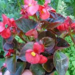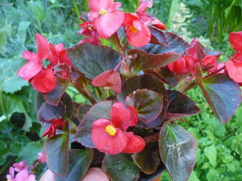 - Бегония краснолистная. Растение получило такое название из-за глубокого красного цвета листьев. Форма листвы овальная, с неровным контуром. Стебель толстый, стелящийся. Цветёт летом розовыми цветочками.