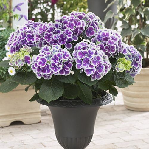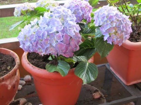 Горшок требуется просторный и широкий, потому что у гортензии корневая система горизонтальная. Пересаживают её методом перевалки для минимизирования стресса. Дно горшка покрывают толстым слоем дренажа. После пересадки в новую ёмкость следует добавить свежий субстрат для заполнения всех пустот, но корневая шейка растения должна располагаться на одном уровне с поверхностью грунта. После посадки гортензии и её увлажнения грунт в горшке лучше всего покрыть торфяной мульчей. В этом случае влага из субстрата не будет так быстро испаряться.