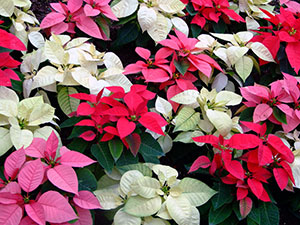 Красная пуансеттия. Является классическим и самым популярным видом. Красные цветы возвышаются над насыщенной зеленой листвой у сортов Сонора, Галактика и Олимпия. У сорта Красный Диамант алые прицветники, у Зимней розы они могут быть слегка завернутыми. У Красного шута видны прожилки темного оттенка, а Чемпион цветет бледно-красными цветками.- Розовая пуансеттия. Существует множество сортов, и эта разновидность часто встречается в цветочных магазинах. У сорта Марен прицветник имеет нежный розовый оттенок, а у Да Винчи и Серебряного мрамора присутствует белая окантовка. Сорт Клубника со сливками имеет розовато-фиолетовые цветки с изрезанными краешками. Встречаются сорта с насыщенной розовой и лососевой расцветкой.