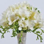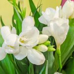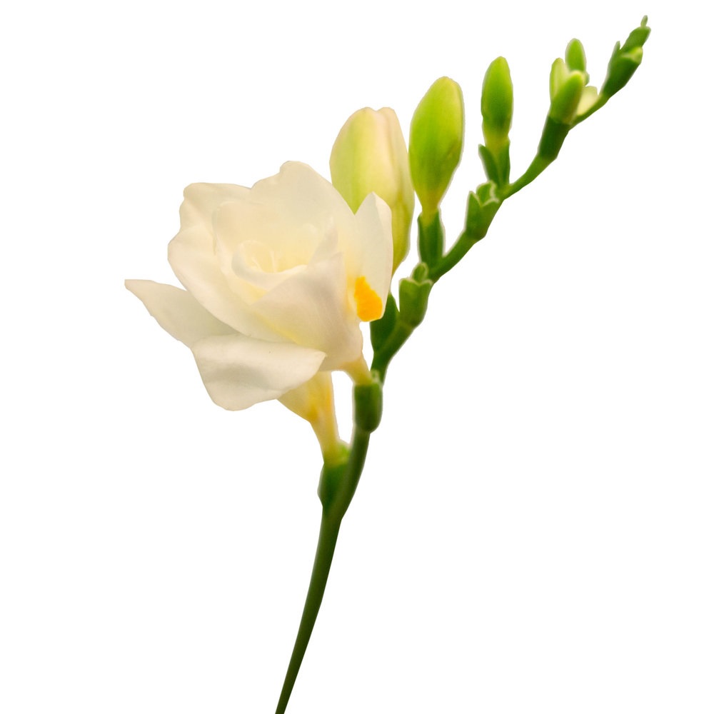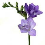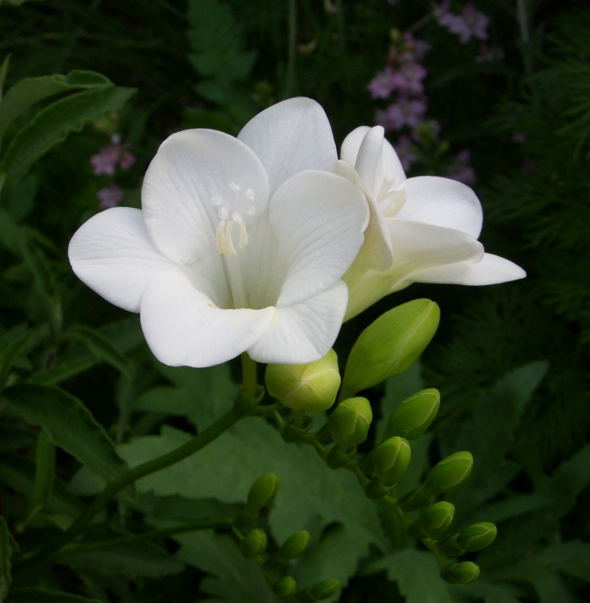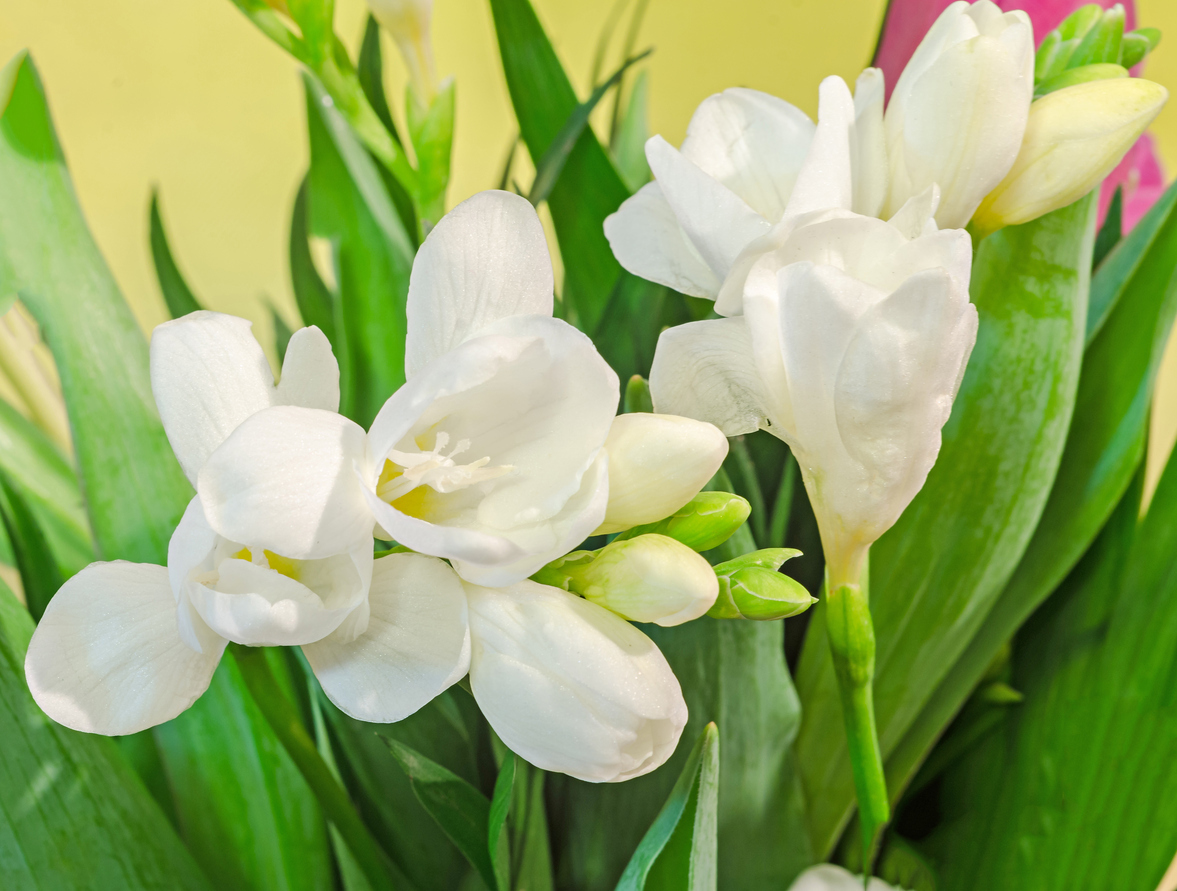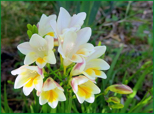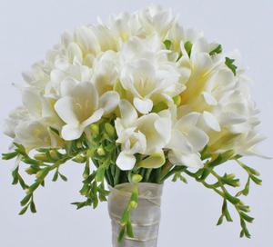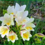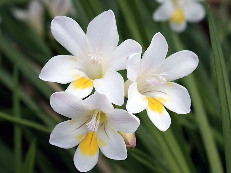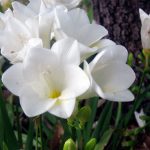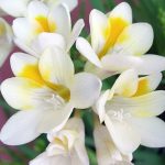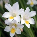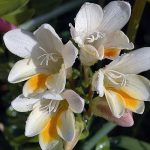 - Белая фрезия — миниатюрный представитель, ростом не более 40 см. Стволы узкие, раскидистые, с колосовидными соцветиями белого или жёлтого колера. Цветёт в апреле.