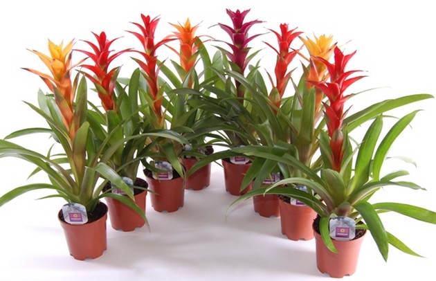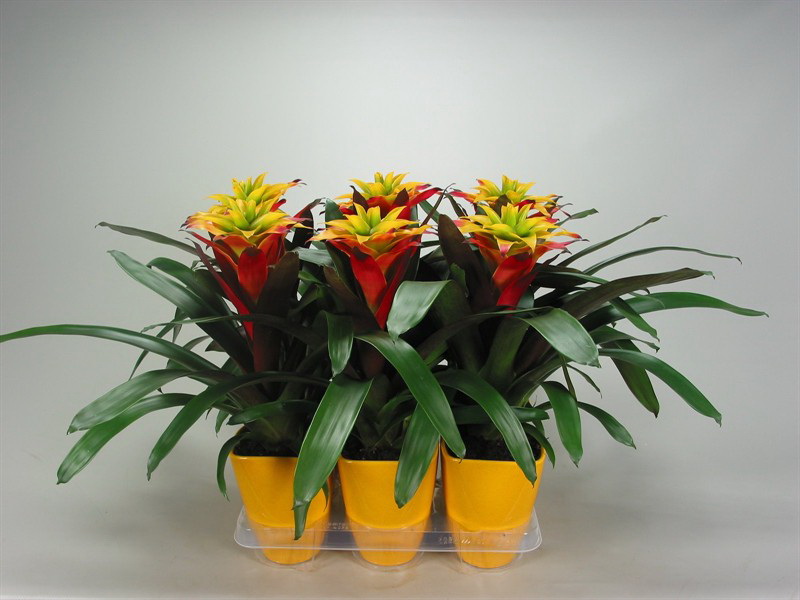 - Сорт Калипсо отличается длинной яркой розеткой из листьев и продолжительно цветущими розовыми, красными, желтыми или оранжевыми прицветниками.