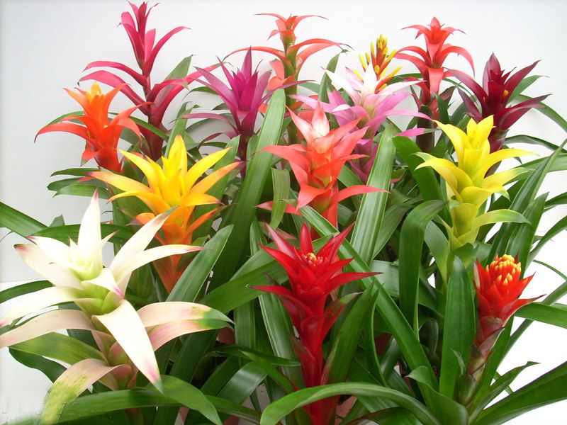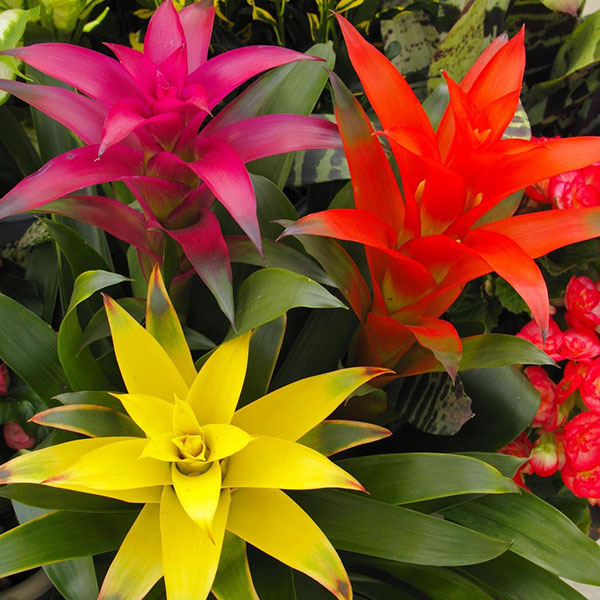 Сегодня в цветочных магазинах можно увидеть комнатные гузмании Микс. Это предназначенные для выращивания в домашних условиях гибриды с розовыми, алыми, бордовыми или желтыми прицветниками.
