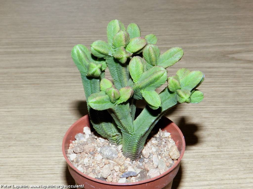 Этот вид растет, образуя кустарник высотой до 25 см. У нее мясистые четырехгранные стелющиеся побеги с завернутыми верхушками. Этот вид к условиям нетребователен, хорошо переносит затенение, яркий свет дарит листовым чешуйкам красноватый оттенок.