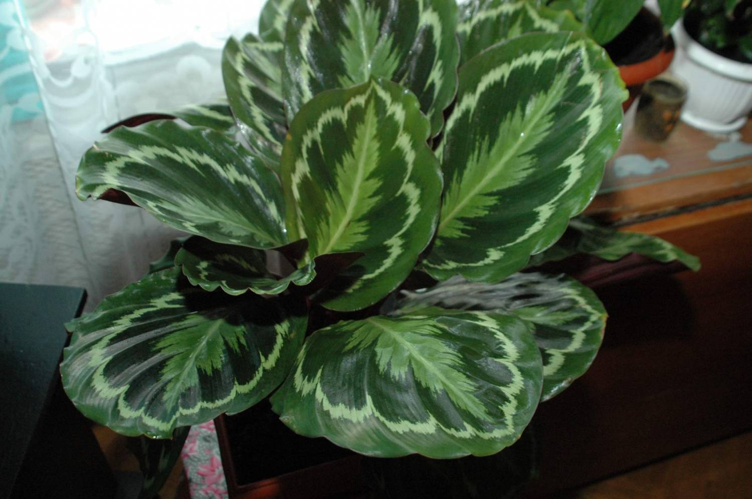 Калатею лучше всего ставить возле окна, но оно обязательно должно быть с гардиной, на листья не должны попадать прямые солнечные лучше. В таких условиях растение чувствует себя комфортно.