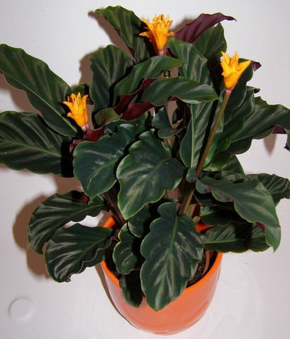 Каланея шафранная отличается яркими оранжевыми лжецветами. Длина листьев достигает тридцати пяти сантиметров. В уходе растение прихотливо, шафранная калатея очень теплолюбива и любит солнечный свет.